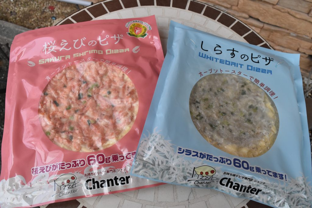 冷凍や持ち帰りで販売する「桜えびのピザ」と「しらすのピザ」。オンラインショップでも買える